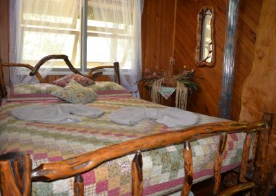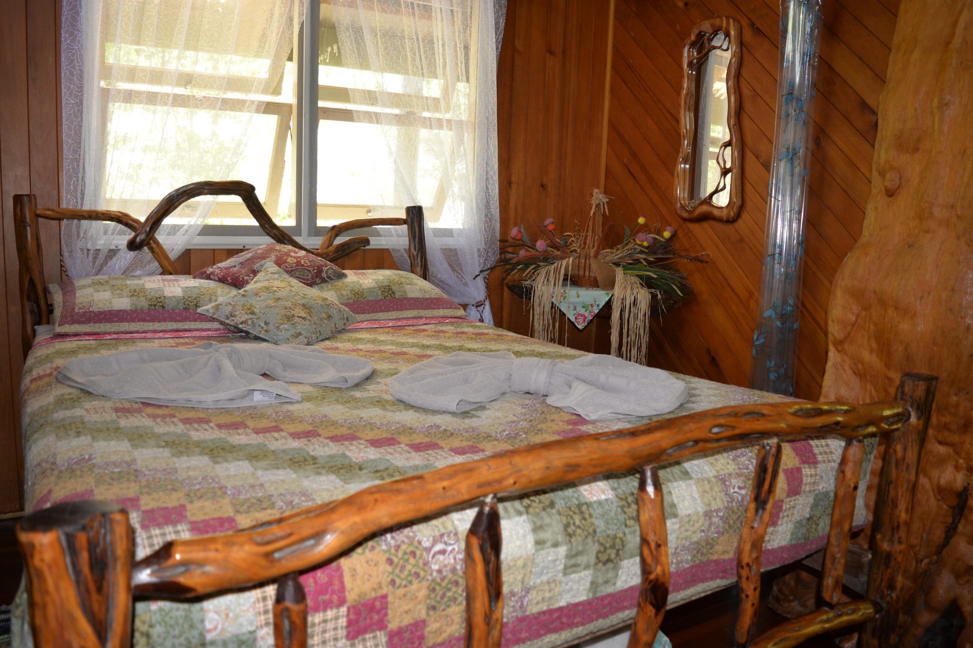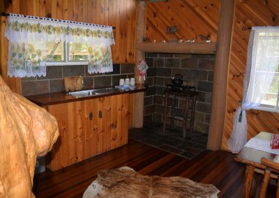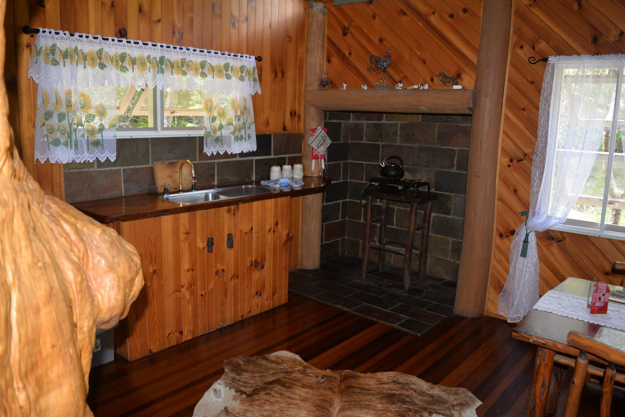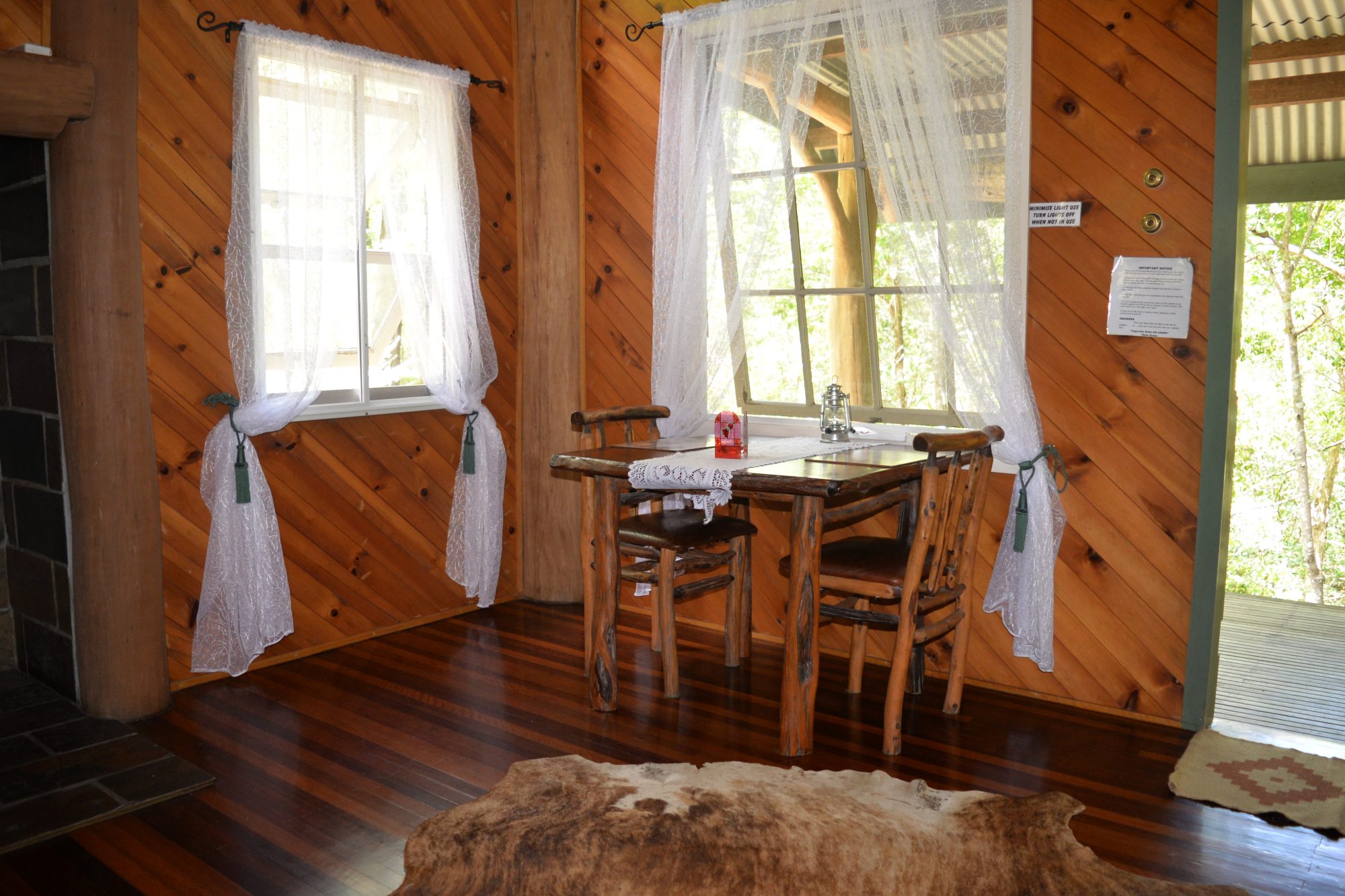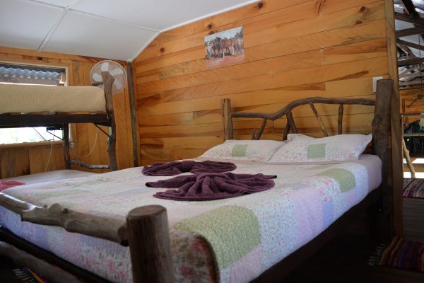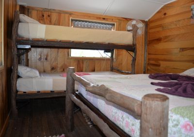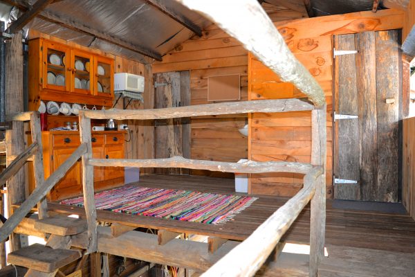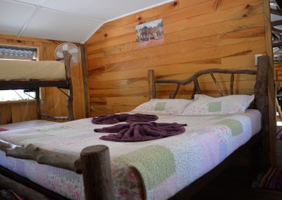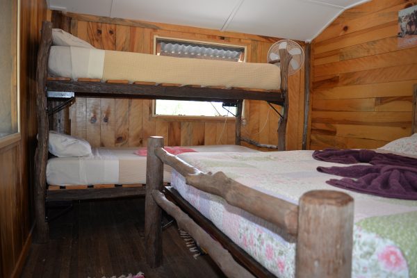 A torch is handy for outside around the campfire. The stable has one queensize bed and one double bunk per room.There are two rooms.